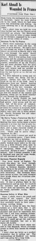 Somewhere In France, 23rd, of February, 1917. Dear Mrs. Dale: For your very welcome letter of December 26, many thanks. Very glad to hear from you and Maui. I am writing this from an ex-German dug-out, 25 feet below the surface. Fritz is indeed very considerate, making these splendid houses as we advance. There are long galleries lined with bunks like on an emigrant steamer. I wish it was a ship, I don’t think anybody would mind if she did roll. I am leaning back in my bunk, writing and thinking of you all far away in sunny, happy Hawaii. I am sipping a cup of tea, smoking a good brand of tobacco, and am very contented. Up above the guns are roaring, the enemy’s shell sweeping the ground, shrieking from rage at the impossibility of touching us. It would be very foolish to walk about up there during the day. We are not very far away from the German lines. It is 4 o’clock. I work nights and have many hours yet before leaving the comforts of this places. I am scout officer, which means crawling about in no man’s land with my “devil may care crew” , worrying the enemy and finding out about him. It is a nice, exciting occupation and not too bad in frosty weather, but in muddy times it is rather unpleasant. We have had a glorious month of winter, plenty of snow and ice, but alas, I knew it woudn’t last. Now the thaw has set in and things are horrible again. Still what’s the use of complaining. It could be worse, I am sure. I have followed with great interest the papers lately and like the views adopted by the U. S. towards the treacherous Hun. I don’t like to see any more countries join the concert now on, but I am certain America won’t hesitate to give our enemy a hiding one of these days. I received my commission at Christmas. You will now address my letters Lieutenant K. Ahnall, etc. Leave, however, is very scarce and prospects at present somewhat dark, still one never knows. Those two patches on my sleeve are my battalion colors. We all wear them and are as proud of them as the banners regiments used to carry at one time, but now done away with. I am enclosing one of these colors. Sincerely yours, KARL.